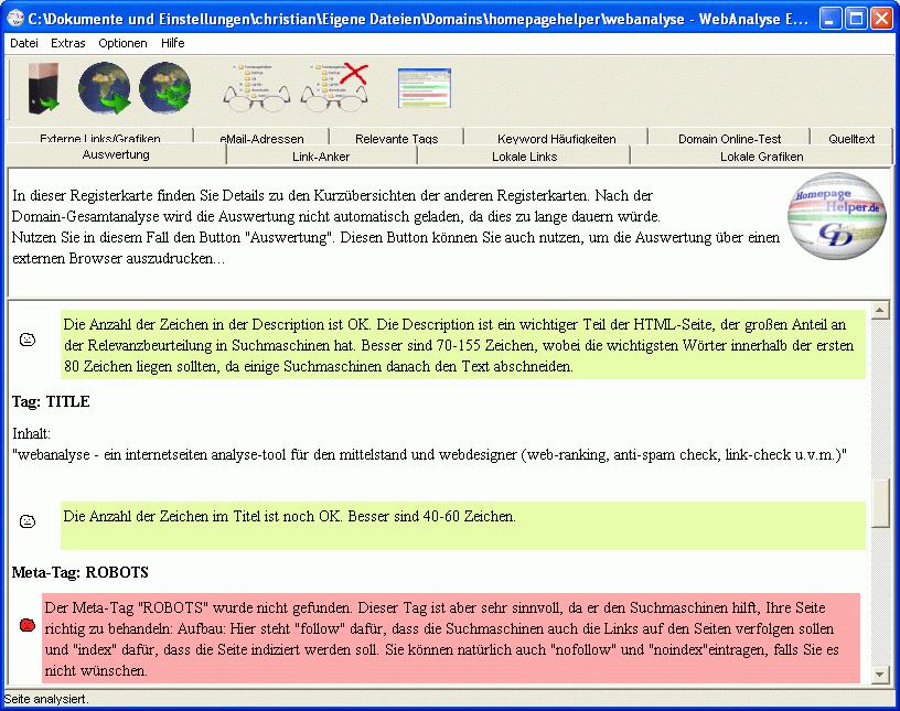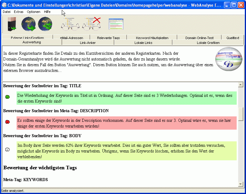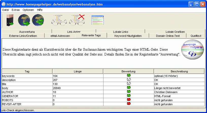 Überprüfung von Seiten auf die wichtigsten Tags. Wenn Hier Optimierungsbedarf besteht, gibt WebAnalyse in der Auswertung detaillierte Informationen. |