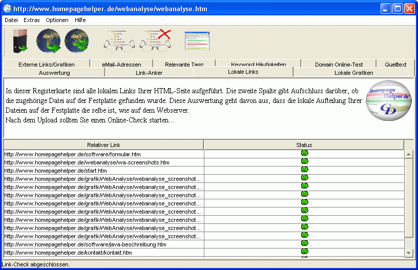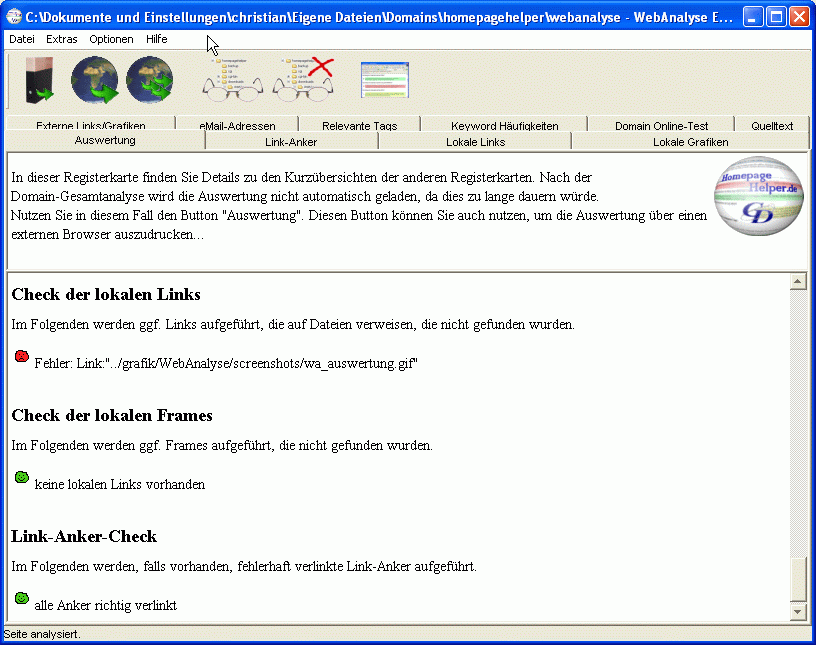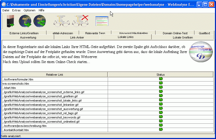 Neben den tabellarischen Übersichten erstellt WebAnalyse zu jeder Seite eine detaillierte Auswertung im HTML-Format. Hier sind alle Informationen zusammengefasst und wenn nötig mit weiteren Erklärungen oder Detail-Infos. In den Screenshots sehen Sie nur wenige Fragmente so einer Auswertung. |