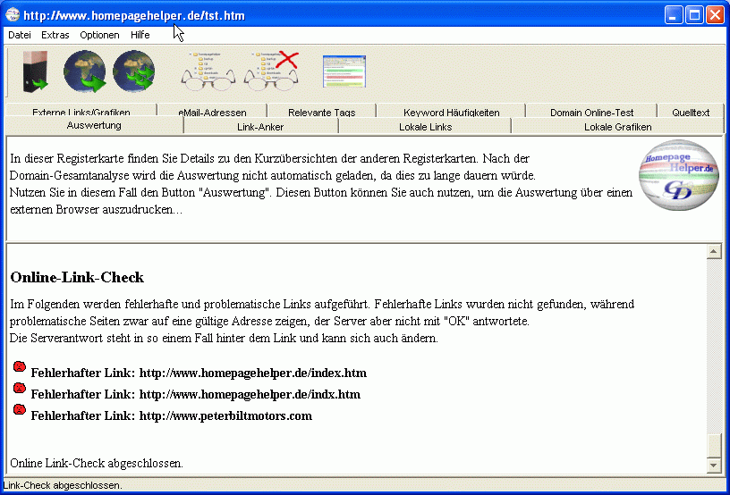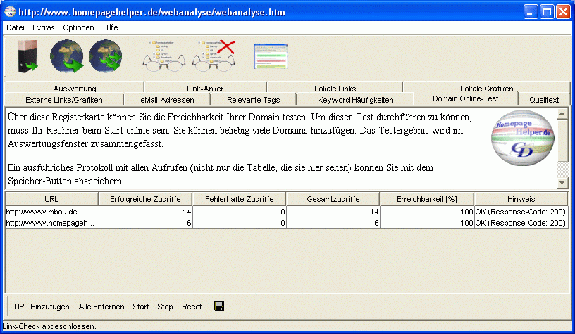 Ab der Professionell-Version von WebAnalyse ist ein Server Erreichbarkeitstest enthalten, über den man die Erreichbarkeit seines Servers überprüfen kann. Neben einer tabellarischen Schnellübersicht kann auch ein detailliertes Protokoll abgespeichert werden. |