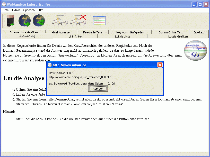 WebAnalyse Enterprise bietet mit nur einem Aufruf eine professionelle Domain-Komplettanalyse. Nach Eingabe einer Startseite lädt WebAnalyse diese Seite und alle Seiten der selben Domain, die über Links in dieser und in Folgeseiten erreichbar sind! Da bei größeren Domains hier sehr große Auswertungen entstehen, ist es optional auch möglich, eine Seite aus einem Unterverzeichnis als Startseite zu wählen. In diesem Fall analysiert WebAnalyse nur die Seiten, die im selben Unterverzeichnis wie die Startseite liegen. |