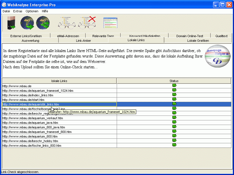 Zu allen gefundenen Links zeigt WebAnalyse die Seiten, in denen der Link genutzt wird als Tooltip-Information an. |