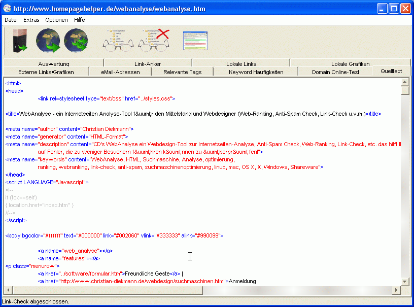 Neben den Detail-Übersichten kann man sich auch den Quelltext heruntergeladener Seiten ansehen. |